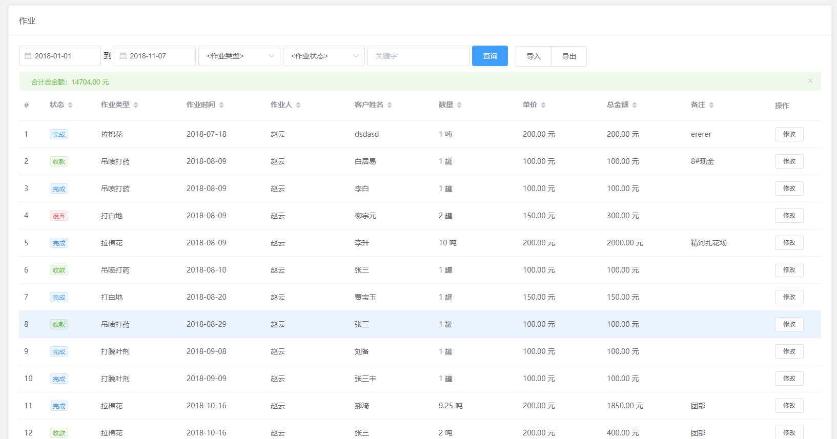 用(yòng)于農(nóng)機(jī)主管理(lǐ)日(rì)常農(nóng)機(jī)作(zuò)業(yè)情況、日(rì)常農(nóng)機(jī)維護支出、農(™nóng)機(jī)作(zuò)業(yè)收款等。包含手機(jī)端農(nóng)機(jī)助手、農(nóng)機(jī)财務、網頁端。